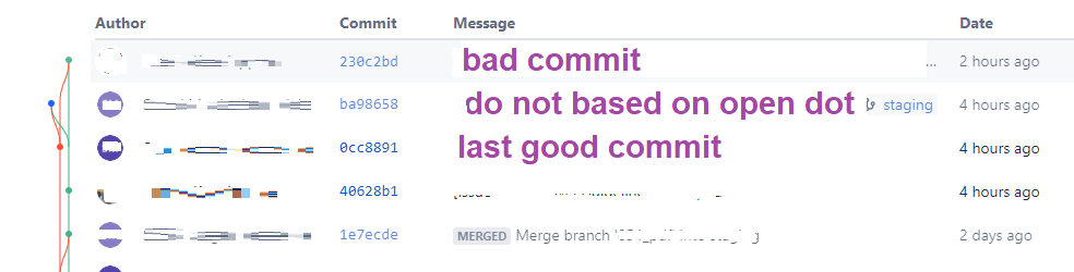 When things go wrong, for example, caused by a bad commit, we need to revert back to an earlier known good commit. To identify the commit to revert to, read the commit graph carefully, pay close attention to the dots on the lines. The commit to revert to should be a closed dot, that is, not an open ended dot behind the bad commit.