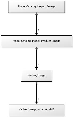 The product image resizing goes through a few layers of abstraction, so I thought I'd add a quick UML diagram showing composition through the layers. The resizing ultimately gets done by the gd PHP extension.