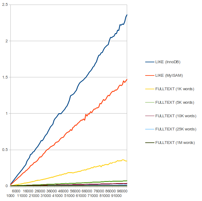 While the FULLTEXT approach was many times faster than the LIKE approach in my tests, both approaches seem to scale linearly with the number of records. For a typical web projects where you need to index well under 5 million words, FULLTEXT will be fast enough to serve your searches until the project reaches end-of-life. But if you expect your data to grow indefinitely, FULLTEXT can only postpone the scaling pain and you will eventually need to deal with it, probably using a non-Mysql solution.