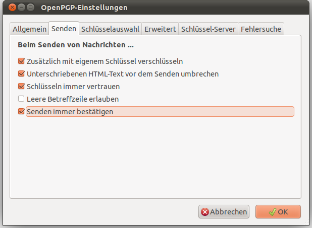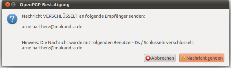 To avoid sending e-mails containing sensitive data unencrypted I strongly suggest you enable a confirmation dialog.