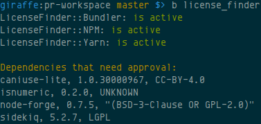 This is how it may look when dependencies need approval (it is also the output of the failing licenses spec):