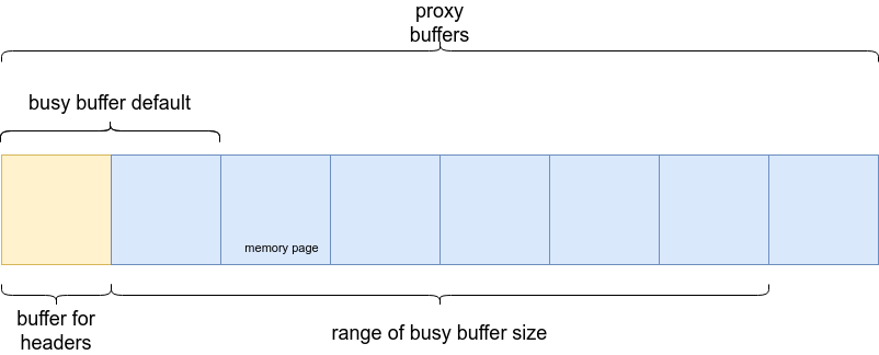 The size of the overall proxy buffer is set by proxy_buffers. By default Nginx uses eight memory pages. This defaults to 8 * 4k = 32k on a system with a page size of 4k.