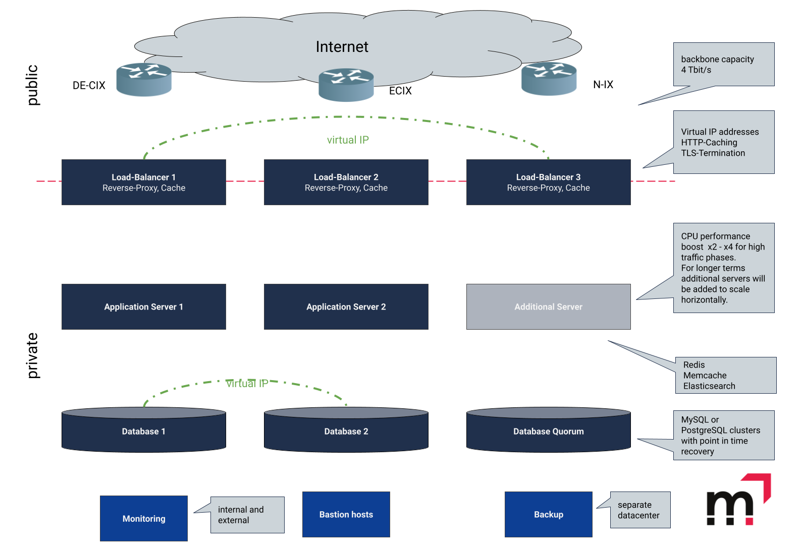We run automated 24/7 performance monitoring to cover the need for adjustments regarding hardware resources. We're using collectd Show archive.org snapshot , graphite Show archive.org snapshot and grafana Show archive.org snapshot for that purpose.