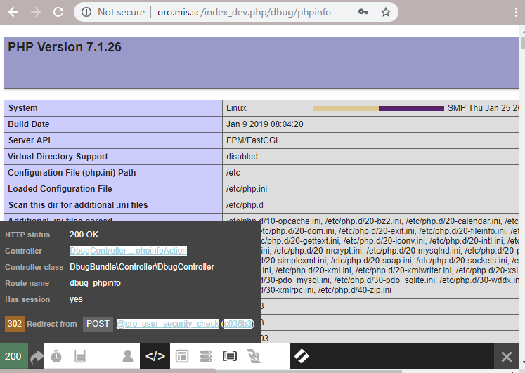 The URL is oro.mis.sc/index_dev.php/dbug/phpinfo.
